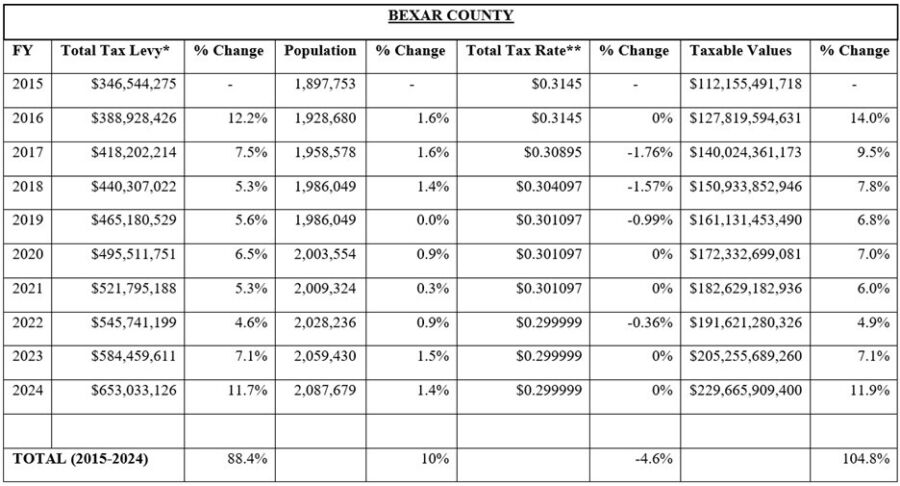 Ideally, an “inverse relationship” exists between rates and values, meaning that as one goes up, the other should come down in relatively similar proportion. In this case, the data shows that Bexar County’s total tax rate hardly declined over the prior decade and those reductions were far outweighed by taxable value growth. As a result, the county’s tax levy increased substantially more than population growth, which offers some partial insight into Bexar County’s property tax woes.