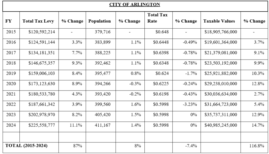 Ideally, an “inverse relationship” exists between rates and values, meaning that as one goes up, the other comes down in relatively similar proportion. In this case, the data shows that Arlington’s total tax rate declined slightly over the prior decade, but those reductions were overshadowed by a much greater growth in taxable values. As a result, the city’s tax levy increased substantially more than population growth, which offers insight into Arlington’s property tax woes.