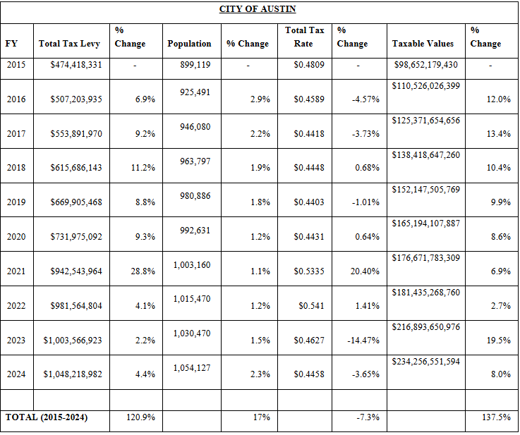 Ideally, an “inverse relationship” exists between rates and values, meaning that as one goes up, the other comes down in relatively similar proportion. In this case, the data shows that Austin’s total tax rate declined slightly over the prior decade but those reductions were overshadowed by a much greater growth in taxable values. As a result, the city’s tax levy increased substantially more than population growth, which offers some insight into Austin’s property tax woes.