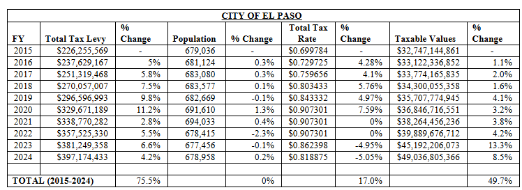 To help answer these questions, let’s review the city’s 2024 Annual Comprehensive Financial Report (ACFR) and gather four types of data—i.e., tax levies, local population, total tax rates, and taxable values—over a 10-year time horizon. Using these audited estimates, we can gauge the growth of government (i.e., tax levy trends), assess its reasonability (i.e., has government grown in response to surging population?), and evaluate whether local elected officials are using their prescribed authority in the tax rate-setting process to properly balance rates and values.