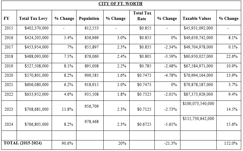Ideally, an “inverse relationship” exists between rates and values, meaning that as one goes up, the other comes down in relatively similar proportion. In this case, the data shows that Fort Worth’s total tax rate declined somewhat, but that reduction was overshadowed by a much greater growth in taxable values. As a result, the city’s tax levy increased substantially more than population growth, which offers some insight into Fort Worth’s property tax woes.
