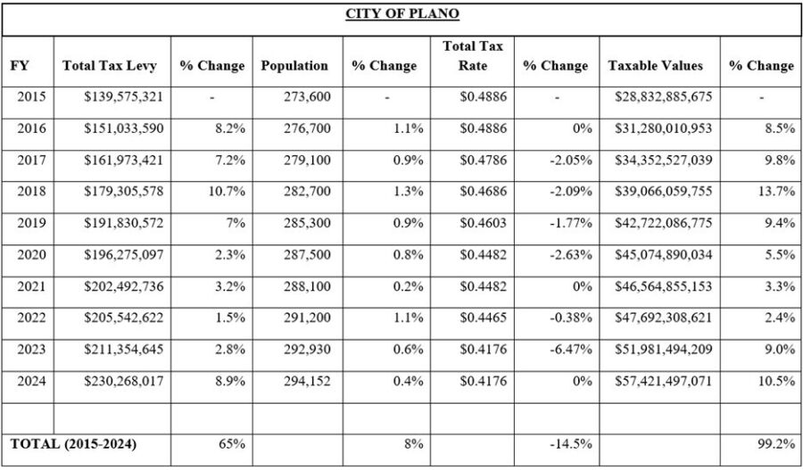 Ideally, an “inverse relationship” exists between rates and values, meaning that as one goes up, the other should come down in relatively similar proportion. In this case, the data shows that Plano’s total tax rate declined modestly over the prior decade, but those reductions were overshadowed by a much greater growth in taxable values. As a result, the city’s tax levy increased substantially more than population growth, which offers some partial insight into Plano’s property tax woes.