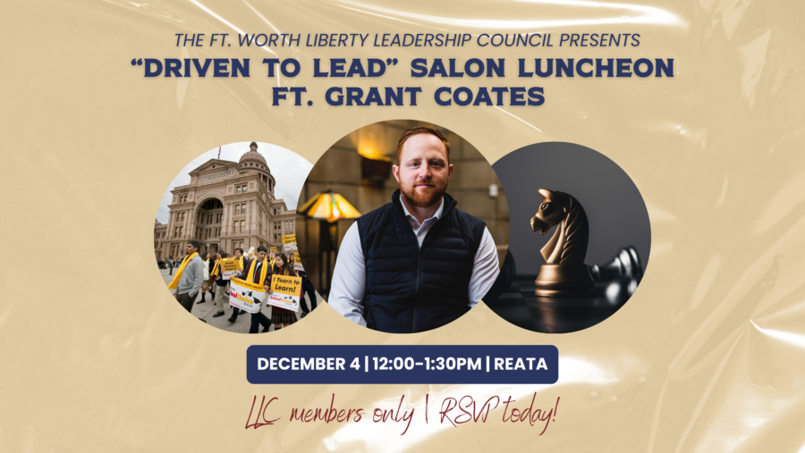 The Fort Worth Liberty Leadership Council* invites you to “Driven to Lead: How Young Texans Can Shape the Future of Education,” an exclusive, members-only luncheon featuring Grant Coates, President and CEO of The Miles Foundation, co-founder of the Ft. Worth LLC, and one of Texas’ leading voices in education, philanthropy, and policy.