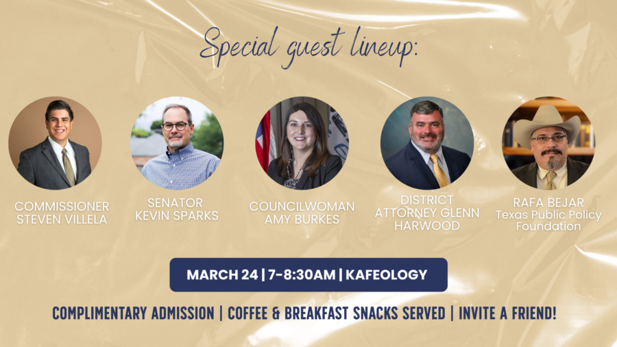 Plan to arrive at the start of the event for brief remarks by our expert speaker, Rafa Bejar of the Texas Public Policy Foundation, then feel free to head out as your schedule requires or stick around to continue the conversation over coffee and breakfast snacks with fellow attendees and our lineup of special guests, including Senator Kevin Sparks, City Councilwoman Amy Stretcher Burkes, Midland County Commissioner Steven Villela, and District Attorney Glenn Harwood.
