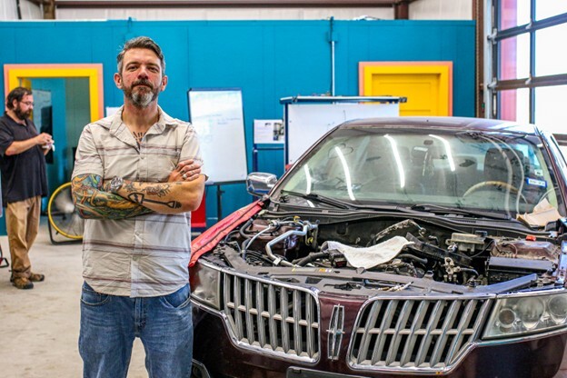 The Other Ones founder Chris Baker alongside a car used for trade classes. (Credit Alex Kindig)