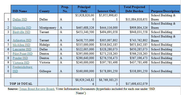 The data gathered is revealing. For instance, Dallas ISD’s $5.93 billion Proposition A is expected to cost almost $12 billion when interest is accounted for. Dallas, Birdville, Lancaster, and Fredericksburg ISDs all expect to pay back more in interest costs than the principal borrowed. And the top 10 largest propositions are projected to cost taxpayers $8.9 billion initially and almost $18 billion upon total repayment.