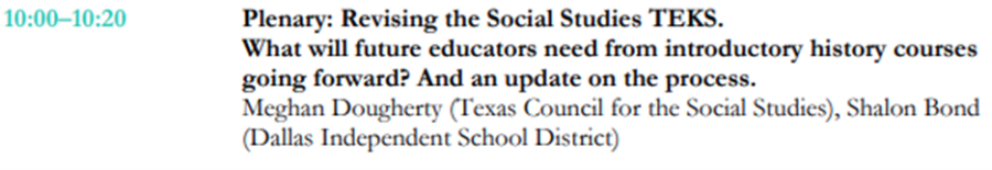 The AHA generously hosted TXCSS officers at this year’s conference to explain to the history educators of Texas that the failed model of Social Studies instruction currently in place must be defended at all costs. No doubt both organizations will be seeking to leverage their privileged position to message to teachers to oppose the new framework.