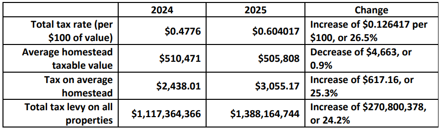 According to its newly-published Notice of Public Hearing on Tax Increase, the average Austin homeowner’s tax bill could soon rise by 25.3%, or an additional $617.16 per year. Should city hall move to adopt this increase and voters approve it in November, then the city’s total tax burden will grow from $2,438.01 to $3,055.17 annually.
