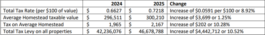For 2025-26, officials have proposed raising the tax rate from $0.6627 per $100 of value to $0.7218 per $100 of value, representing a growth of 8.92%. Meanwhile, the average homestead’s taxable value is expected to jump by 10.28%. The combination of these two factors—higher rates, higher values—will force tax bills up.