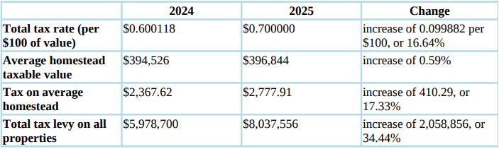 For 2025-26, officials have proposed raising the tax rate from $0.600118 per $100 of value to $0.7 per $100 of value, representing a growth of 16.64%. Meanwhile, the average homestead’s taxable value is expected to rise by 0.59%. The combination of these two factors—higher rates, higher values—will force tax bills up.
